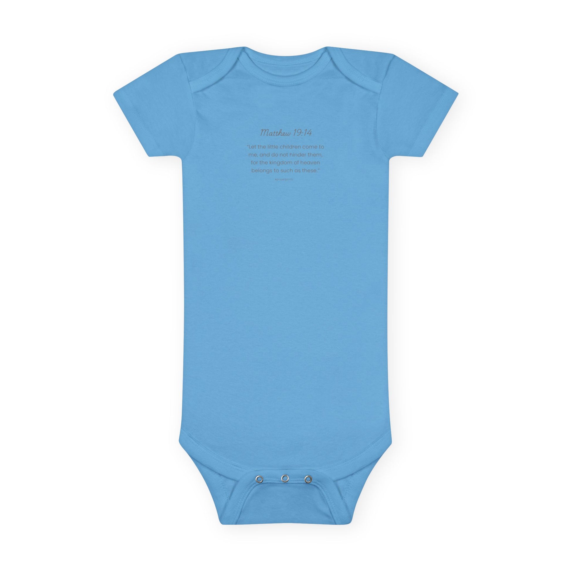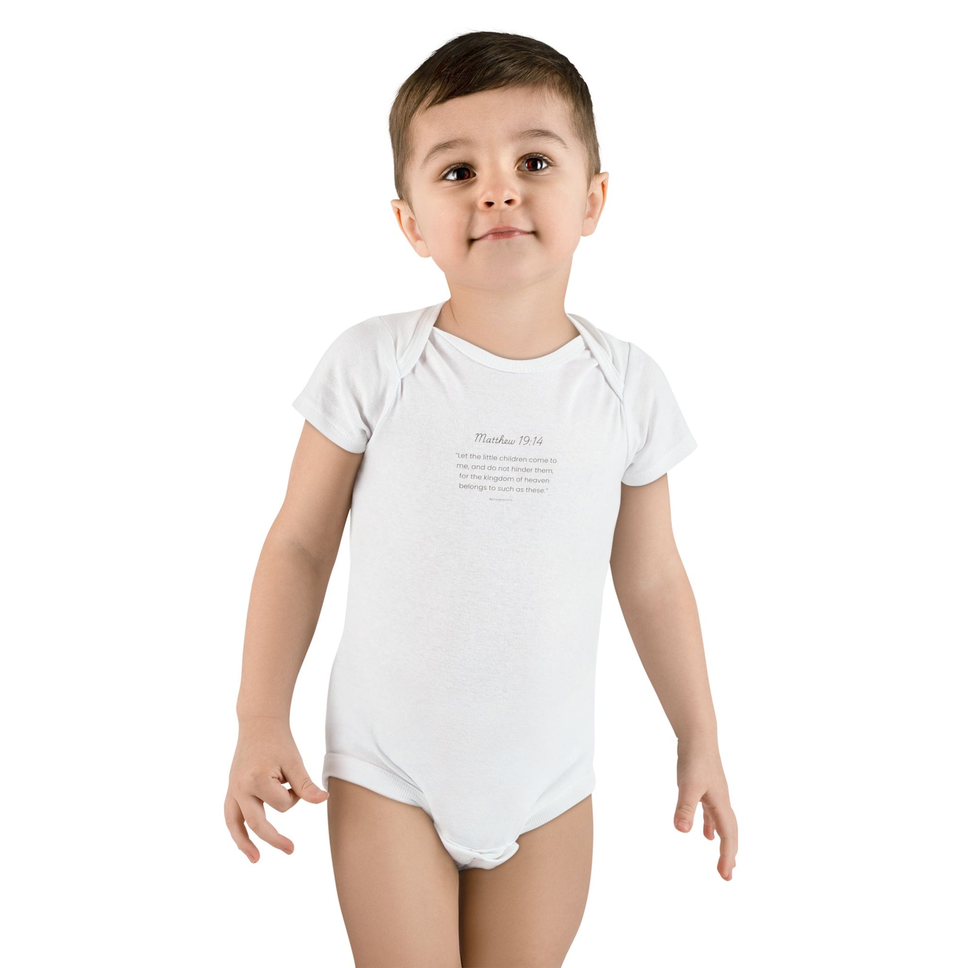 The custom short-sleeve baby Onesie® is built from 100% cotton rib. This makes for a comfortable, secure fitting for newborns and toddlers. The neckline is constructed with a lap shoulder. This inclusion assists with manipulating the fabric around the baby’s head. The bottom has a snap closure - designed with easy changing in mind. Both legs have ribbed openings for stability.